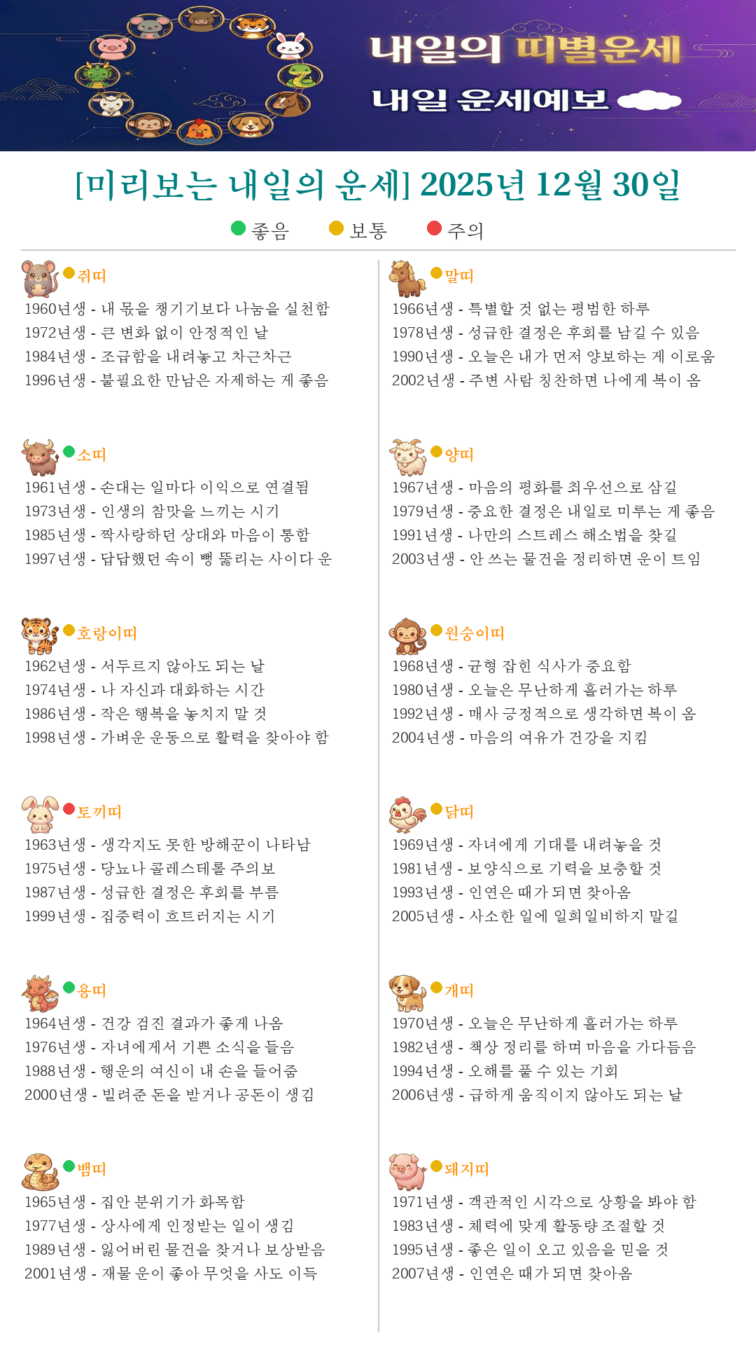 | 하루를 버텨낸 퇴근길, 우리는 내일을 막연히 걱정하면서도 정작 내일을 준비할 시간은 갖지 못한 채 집으로 향합니다. 메타X는 ‘미래를 예측하는 운세’가 아니라, 내일을 조금 더 단단하게 맞이하기 위한 마음의 점검표로서 띠별 운세를 다시 해석하고자 합니다.〈퇴근길 미리보는 내일의 띠별운세〉는 오늘의 피로를 내려놓고, 내일의 선택을 조금 더 차분하게 바라보자는 취지에서 시작됐습니다. AI·기술·데이터의 시대에도사람은 여전히 마음의 방향이 필요하다는 전제 아래, 이 연재는 과장된 예언 대신 ‘생활 밀착형 조언’에 집중합니다. 오늘도 고생 많으셨습니다.[편집자주] |
