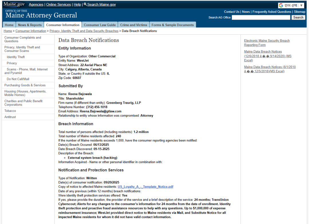 캐나다 2위 항공사 웨스트젯(WestJet)이 대규모 데이터 유출 사고를 공식 확인했다. 이번 사건으로 무려 120만 명의 승객 개인 정보가 해킹 공격을 통해 외부로 유출된 것으로 드러났다. 이 가운데 미국 메인주 주민 240명도 피해자에 포함돼 있으며, 웨스트젯은 해당 주 법에 따라 당국에 보고서를 제출했다.