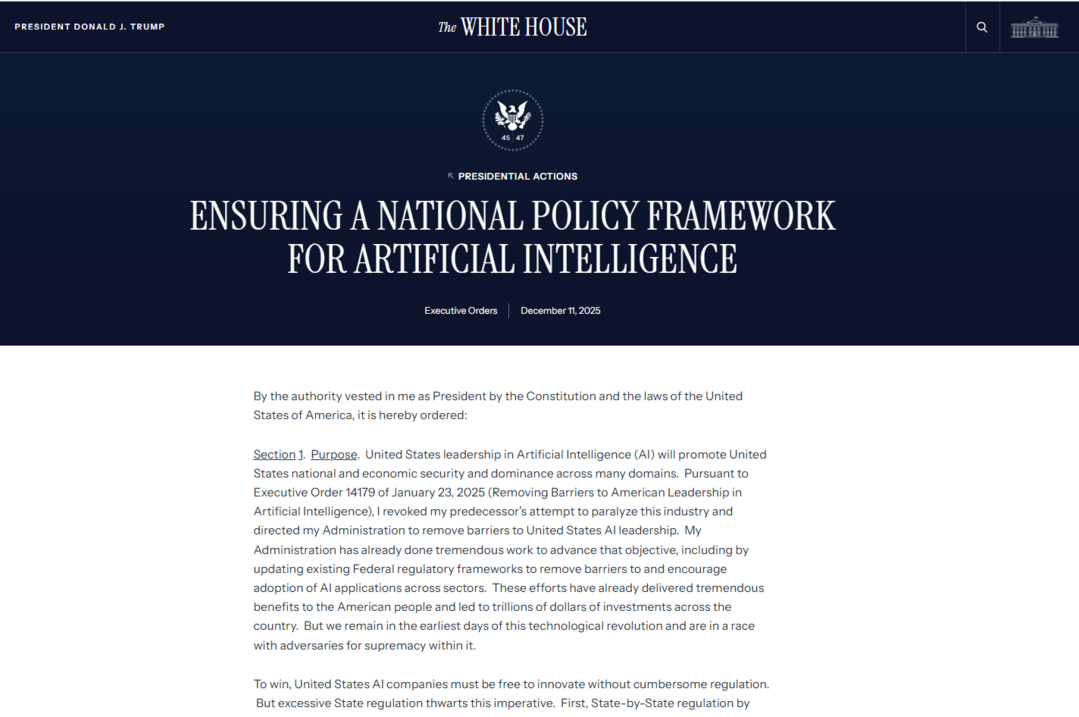 미국 행정부가 인공지능(AI) 규제의 중심축을 주(州) 정부에서 연방 정부로 명확히 이동시키는 강력한 정책 전환에 나섰다. 도널드 트럼프 대통령은 2025년 12월 11일 「인공지능에 대한 국가 정책 프레임워크 확립(Ensuring a National Policy Framework for Artificial Intelligence)」 행정명령에 서명하며, 미국의 AI 글로벌 주도권을 저해한다고 판단되는 주별 AI 규제에 대해 본격적인 제동을 걸겠다고 선언했다.