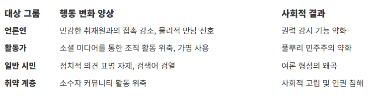 디지털 감시가 일상화된 사회에서 발생하는 가장 파괴적인 결과는 시민들의 자발적인 자기검열, 즉 위축 효과다. 이는 민주주의의 기초인 사상의 자유와 토론의 문화를 질식시킨다.