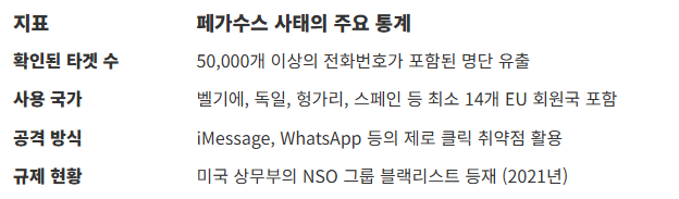 암호화가 기술적으로 견고하더라도, 사용자의 기기 자체를 감염시키는 스파이웨어는 E2EE의 보호를 무의미하게 만든다. 이스라엘 NSO 그룹의 페가수스(Pegasus)는 그 대표적인 사례로, 전 세계 14개국 이상의 정부가 이를 구매하여 언론인, 인권 활동가, 정치적 반대자를 사찰하는 데 사용했다.
