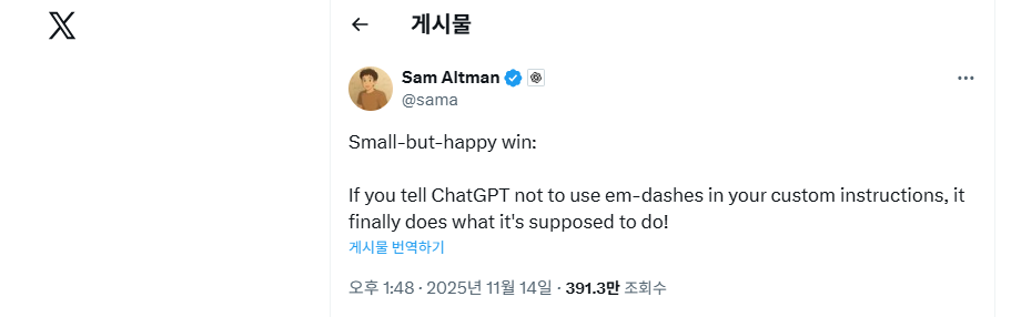 그러던 2025년 11월 14일 오후 1:48 샘 올트먼은 X에 한 문장을 남겼다.