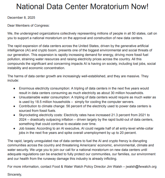 해당 요구는 2025년 12월 8일 미 의회에 전달된 공개서한 형태로 제기됐다. 서한에는 미국 50개 주 전역에서 수백 개 단체, 수백만 명의 시민을 대표하는 조직들이 공동 서명했으며, 데이터센터 확장이 “우리 세대가 직면한 가장 중대한 환경·사회적 위협 중 하나”라고 규정했다.