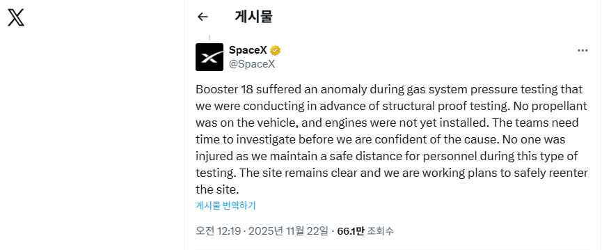 이번 부스터 18 사고는 인명 피해 없이 제한적 상황에서 발생했지만, 스페이스X 개발 방식의 구조적 리스크를 상기시키는 사건이다. 추진제 없는 압력시험 단계에서조차 이상이 나타났다는 점은 향후 고위험 단계에서의 잠재적 변수를 더욱 면밀히 점검해야 함을 의미한다.