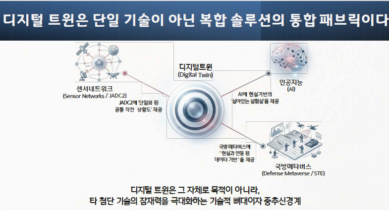 사용자가 제시한 첫 번째 고려사항에서 알 수 있듯이, 현대 국방 분야에서 디지털 트윈은 독립된 기술이 아닌, AI, 메타버스, 센서 네트워크와 같은 핵심 기술들을 연결하고 시너지를 극대화하는 '복합 솔루션'의 중추 신경계로 기능합니다. 디지털 트윈은 그 자체로 목적이 아니라, 다른 기술들을 위한 고충실도의 데이터 기반이자 시뮬레이션 플랫폼입니다.