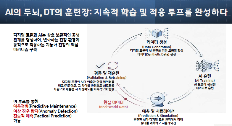 5. AI 재훈련 (DT to AI): 이 검증 과정에서 생성된 새로운 데이터(예측과 현실의 차이)는 AI 모델을 자동으로 '재훈련(retrain)'시키는 데 사용되어 12, AI의 정확도를 지속적으로 향상시킵니다.