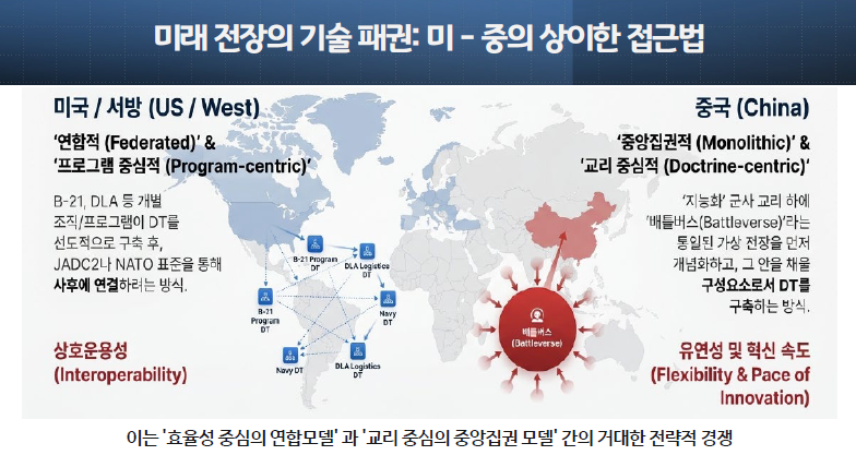 즉, 서방은 '각자의 DT'를 만들어 '연결(JADC2)'하려 애쓰는 반면, 중국은 '하나의 배틀버스'를 선언하고 그 '구성요소(DT)'를 만들려 합니다. 이는 '효율성 중심의 연합 모델'과 '교리 중심의 중앙집권 모델' 간의 거대한 전략적 경쟁입니다.