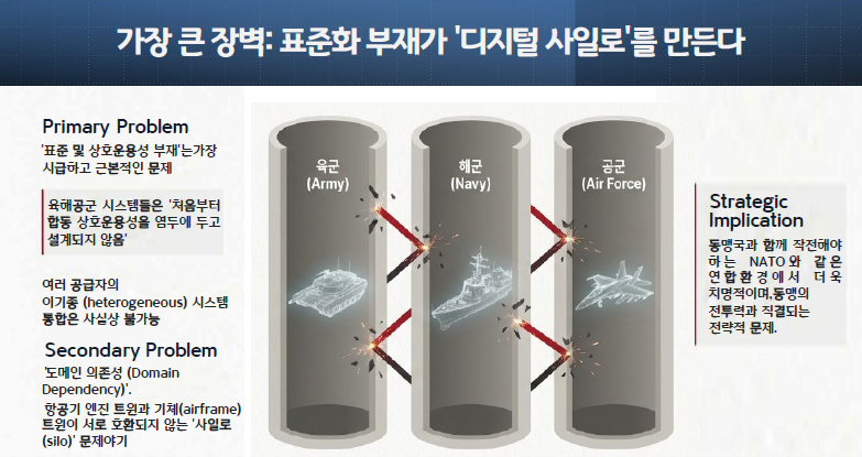 OA는 상호운용성 문제의 가장 현실적인 기술적 해법입니다. B-21 폭격기의 '전체 디지털 개방형 아키텍처'는 특정 공급업체에 종속되지 않고, 향후 수십 년간 새로운 위협에 대응하기 위해 하드웨어와 소프트웨어를 유연하게 교체할 수 있도록 보장합니다.27 개방형 아키텍처는 "모델, 프로세스, 소프트웨어 등을 표준화"하여 43 오류를 줄이고, 기존의 "레거시 인프라와도 통합" 2할 수 있는 유연성을 제공합니다.