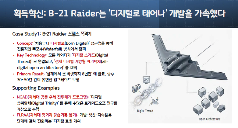 ● B-21 Raider (스텔스 폭격기): B-21은 '디지털화(Digitalization)' 덕분에 "설계에서 첫 비행까지 8년" 만에 완료되는 성과를 보였습니다.27 특히 '전체 디지털 개방형 아키텍처(all-digital open architecture)' 27를 채택하여, 향후 30년에서 50년 동안 새로운 위협에 대응하기 위한 하드웨어 및 소프트웨어 업그레이드가 용이하도록 설계되었습니다.27