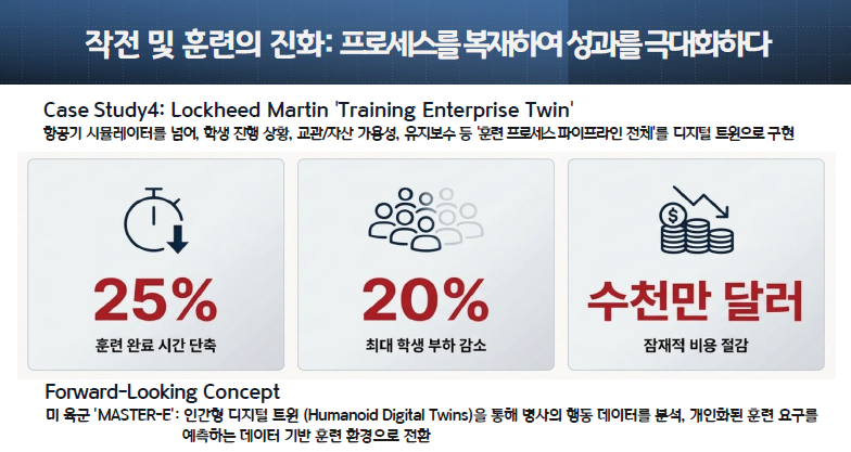 ● 록히드마틴 (훈련 기업 트윈): 이 사례는 '디지털 오퍼레이션 트윈'의 가장 성공적인 전형을 보여줍니다.33 록히드마틴은 단순히 항공기 시뮬레이터를 만든 것이 아니라, "훈련 파이프라인을 통과하는 학생의 진행 상황", 교관 가용성, 항공기 및 시뮬레이터와 같은 "훈련 자산의 가용성", 그리고 "유지보수 요구사항" 등 훈련 프로세스 기업(Training Enterprise) 전체를 디지털 트윈으로 구현했습니다.