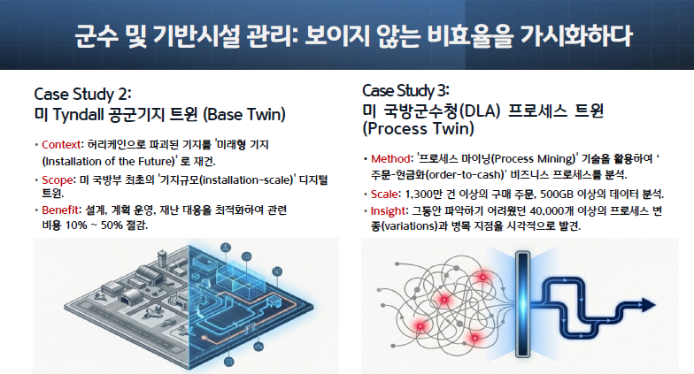 ● 미 국방군수청 (DLA) (프로세스 디지털 트윈): DLA는 '프로세스 마이닝(Process Mining)' 기술을 활용하여, 복잡한 군수 업무의 '프로세스 디지털 트윈'을 생성했습니다.35