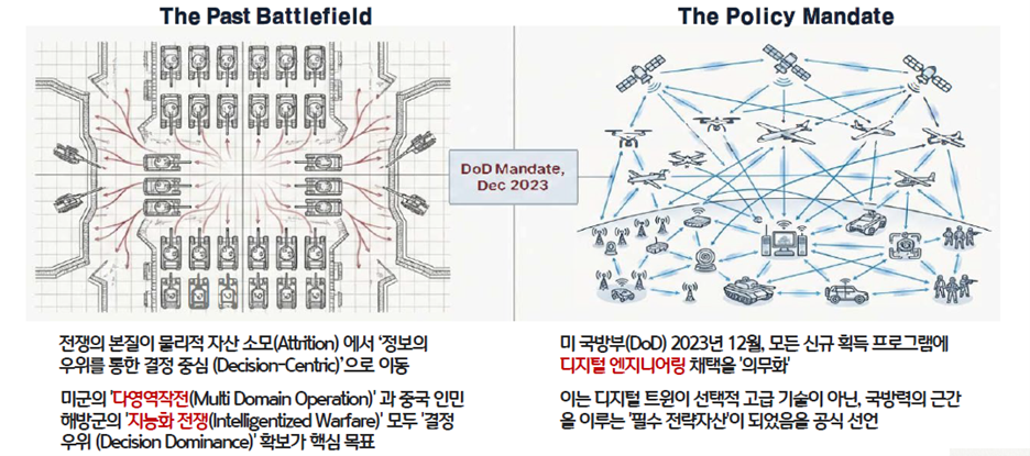 미래 전장의 양상은 물리적 자산의 소모(attrition)를 중심으로 하던 과거의 패러다임에서 벗어나, '정보 및 결정 중심(decision-centric)'으로 급격히 이동하고 있습니다.7 미군은 '모자이크 전(Mosaic Warfare)'과 같은 새로운 작전 개념을 통해, 적보다 더 빠르고 정확한 결정을 내리는 것을 전쟁 승리의 핵심으로 보고 있습니다.8 동시에 중국 인민해방군(PLA) 역시 디지털 트윈 기술이 전장에서 '정보 우위(information advantage)'를 제공하여 궁극적으로 '결정 우위(decision dominance)'를 창출할 수 있다는 정확한 전략적 평가를 내리고 있습니다.9