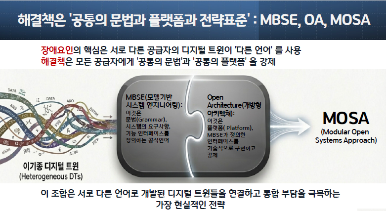 ● 문제의 본질: 장애요인의 핵심은 서로 다른 공급자(예: 록히드마틴, 노스롭그루먼)의 디지털 트윈이 서로 '다른 언어'를 사용한다는 것입니다.1 이는 '도메인 의존성' 1과 '데이터/모델 통합 부담' 1의 근본 원인입니다.