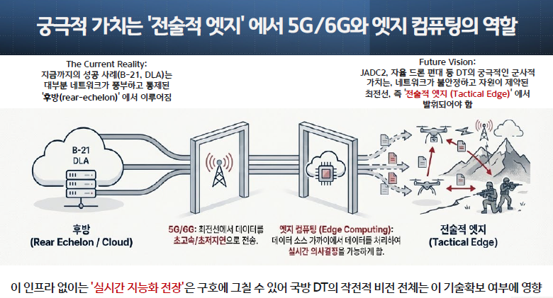 따라서, 국방 디지털 트윈의 '작전적(operational)' 비전 전체는, 전술적 엣지에서 실시간으로 대용량 데이터를 처리(Edge Computing) 69하고 초고속/초저지연으로 전송(5G/6G) 68할 수 있는 차세대 통신 및 컴퓨팅 인프라의 확보 여부에 달려있습니다. 이 인프라 없이는 '실시간 지능화 전장'은 구호에 그칠 수 있습니다.