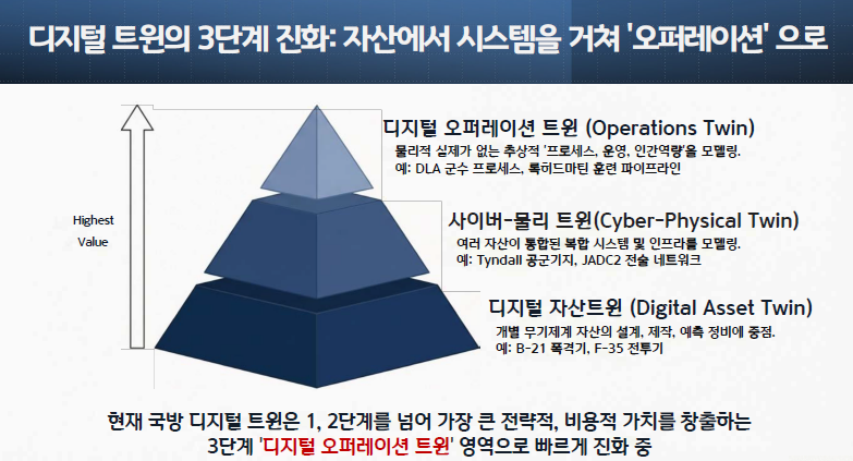 현재 국방 분야의 디지털 트윈은 1, 2단계를 넘어, DLA와 록히드마틴 사례에서 보듯이 가장 큰 전략적, 비용적 가치를 창출하는 3단계 '디지털 오퍼레이션 트윈' 영역으로 빠르게 진화하고 있습니다.