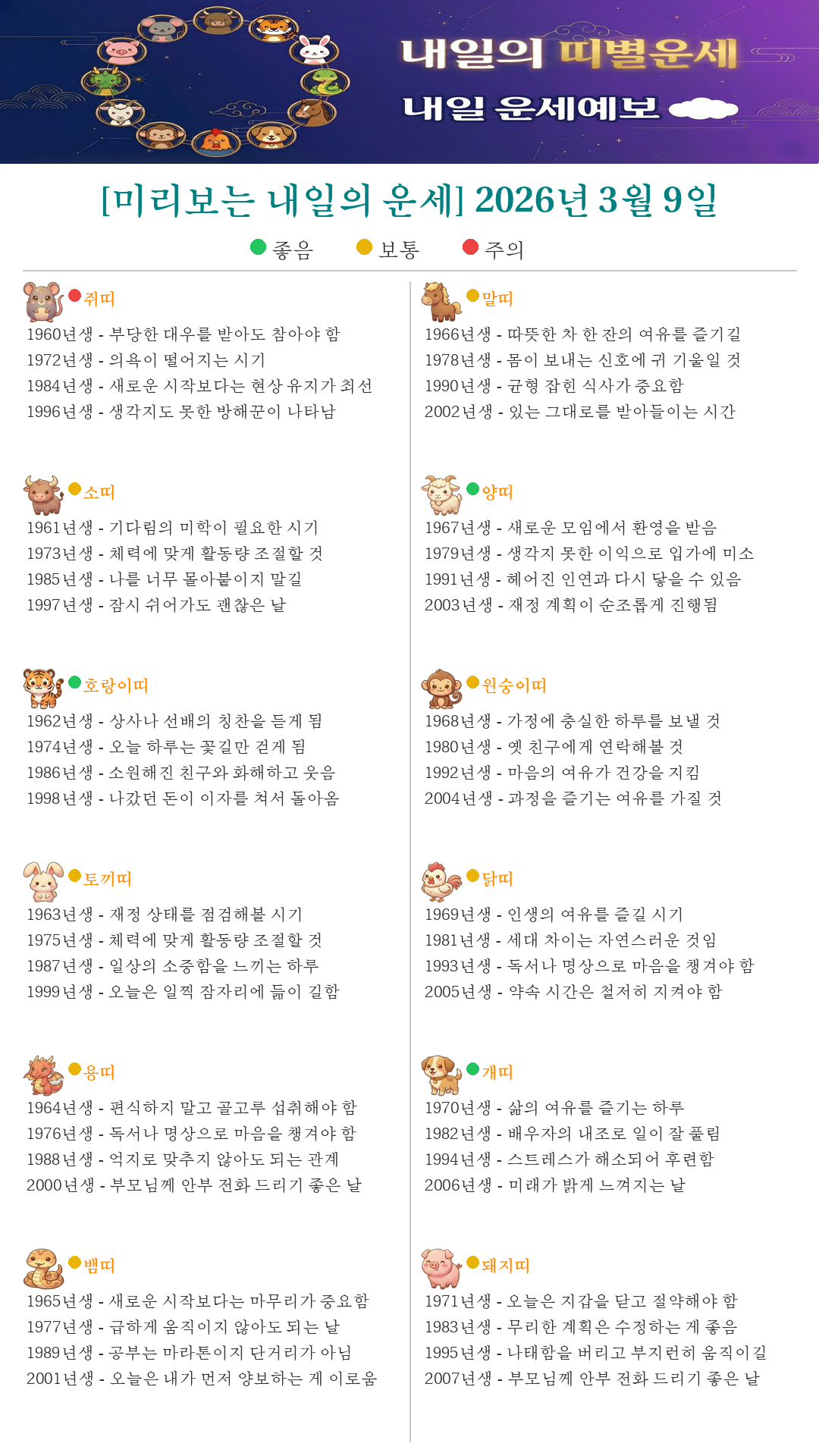 [미리보는 내일의 운세] 2026년 3월 9일