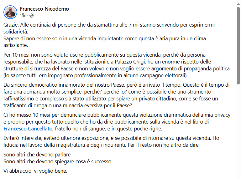이탈리아 정치 전략가이자 전 총리실(팔라초 키지) 보좌관 프란체스코 니코데모(Francesco Nicodemo)가 10개월간 침묵을 깨고, 국가 감시용 스파이웨어로 사찰당한 사실을 공개했다.
