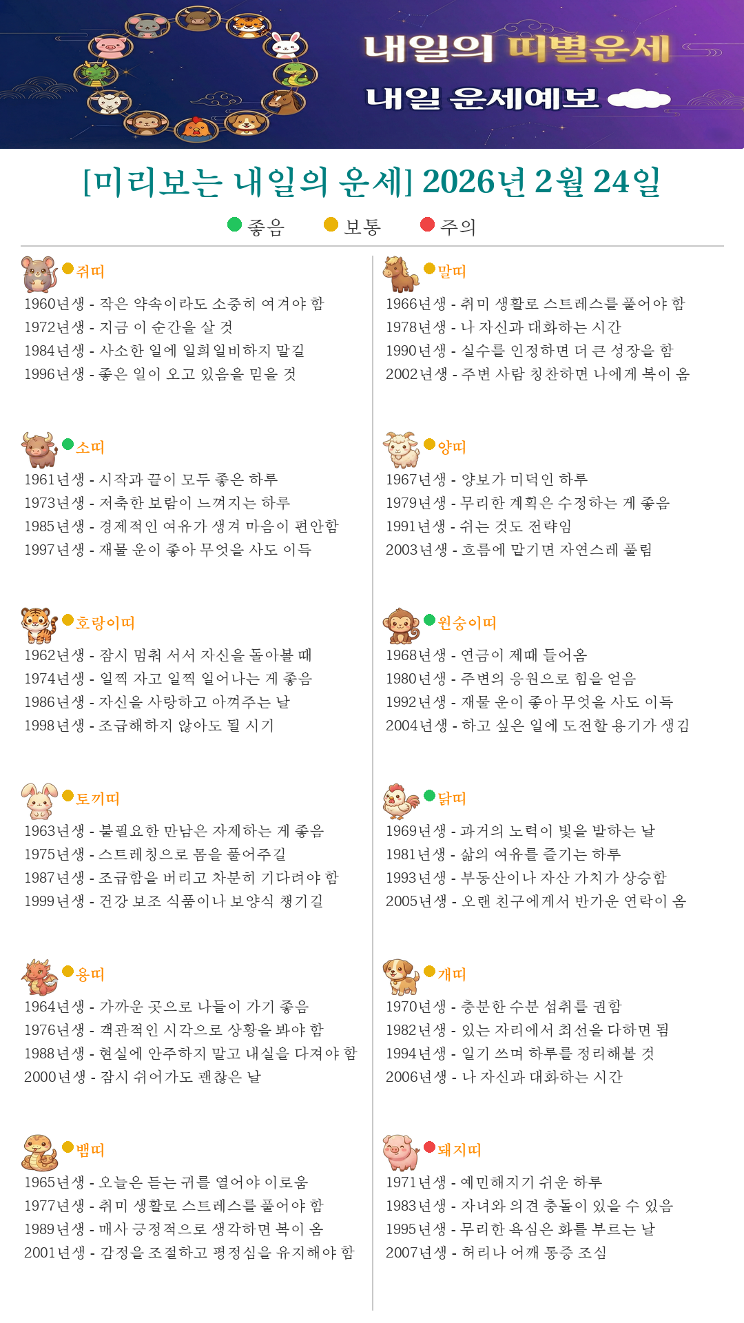 | 하루를 버텨낸 퇴근길, 우리는 내일을 막연히 걱정하면서도 정작 내일을 준비할 시간은 갖지 못한 채 집으로 향합니다. 메타X는 ‘미래를 예측하는 운세’가 아니라, 내일을 조금 더 단단하게 맞이하기 위한 마음의 점검표로서 띠별 운세를 다시 해석하고자 합니다.〈퇴근길 미리보는 내일의 띠별운세〉는 오늘의 피로를 내려놓고, 내일의 선택을 조금 더 차분하게 바라보자는 취지에서 시작됐습니다. AI·기술·데이터의 시대에도사람은 여전히 마음의 방향이 필요하다는 전제 아래, 이 연재는 과장된 예언 대신 ‘생활 밀착형 조언’에 집중합니다. 오늘도 고생 많으셨습니다.[편집자주] |