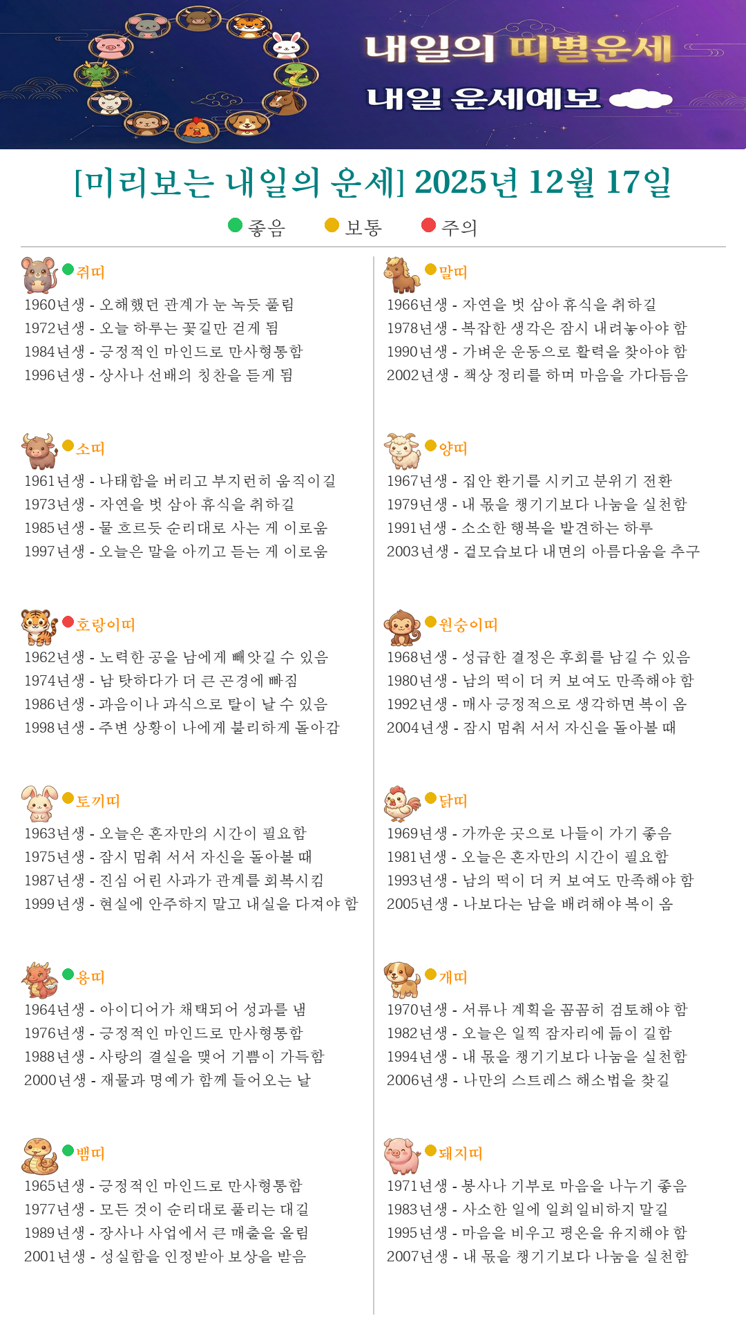 | 하루를 버텨낸 퇴근길, 우리는 내일을 막연히 걱정하면서도 정작 내일을 준비할 시간은 갖지 못한 채 집으로 향합니다. 메타X는 ‘미래를 예측하는 운세’가 아니라, 내일을 조금 더 단단하게 맞이하기 위한 마음의 점검표로서 띠별 운세를 다시 해석하고자 합니다.〈퇴근길 미리보는 내일의 띠별운세〉는 오늘의 피로를 내려놓고, 내일의 선택을 조금 더 차분하게 바라보자는 취지에서 시작됐습니다. AI·기술·데이터의 시대에도사람은 여전히 마음의 방향이 필요하다는 전제 아래, 이 연재는 과장된 예언 대신 ‘생활 밀착형 조언’에 집중합니다. 오늘도 고생 많으셨습니다.[편집자주] |