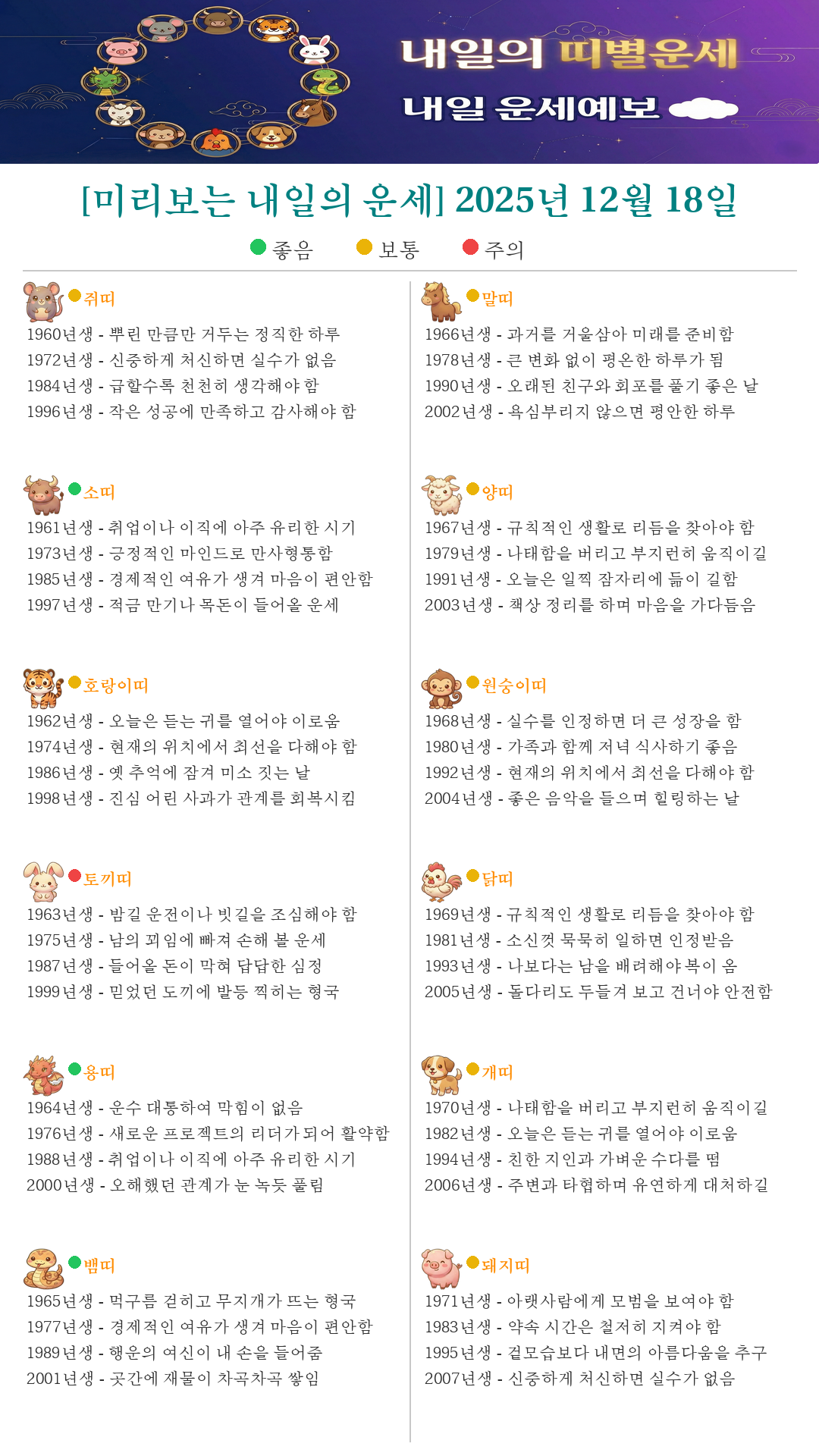 | 하루를 버텨낸 퇴근길, 우리는 내일을 막연히 걱정하면서도 정작 내일을 준비할 시간은 갖지 못한 채 집으로 향합니다. 메타X는 ‘미래를 예측하는 운세’가 아니라, 내일을 조금 더 단단하게 맞이하기 위한 마음의 점검표로서 띠별 운세를 다시 해석하고자 합니다.〈퇴근길 미리보는 내일의 띠별운세〉는 오늘의 피로를 내려놓고, 내일의 선택을 조금 더 차분하게 바라보자는 취지에서 시작됐습니다. AI·기술·데이터의 시대에도사람은 여전히 마음의 방향이 필요하다는 전제 아래, 이 연재는 과장된 예언 대신 ‘생활 밀착형 조언’에 집중합니다. 오늘도 고생 많으셨습니다.[편집자주] |