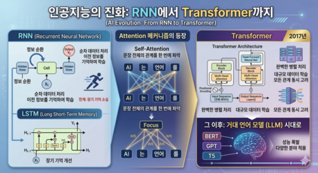 그러나 오늘날 생성형 AI 혁명을 가능하게 만든 기술은 Transformer다. 2017년 구글 연구진이 발표한 논문 「Attention Is All You Need」에서 처음 제안된 이 구조는 기존의 RNN과 LSTM 기반 자연어 처리 모델을 근본적으로 바꾸어 놓았다. Transformer의 핵심은 애텐션 메커니즘(Attention Mechanism)에 있다.