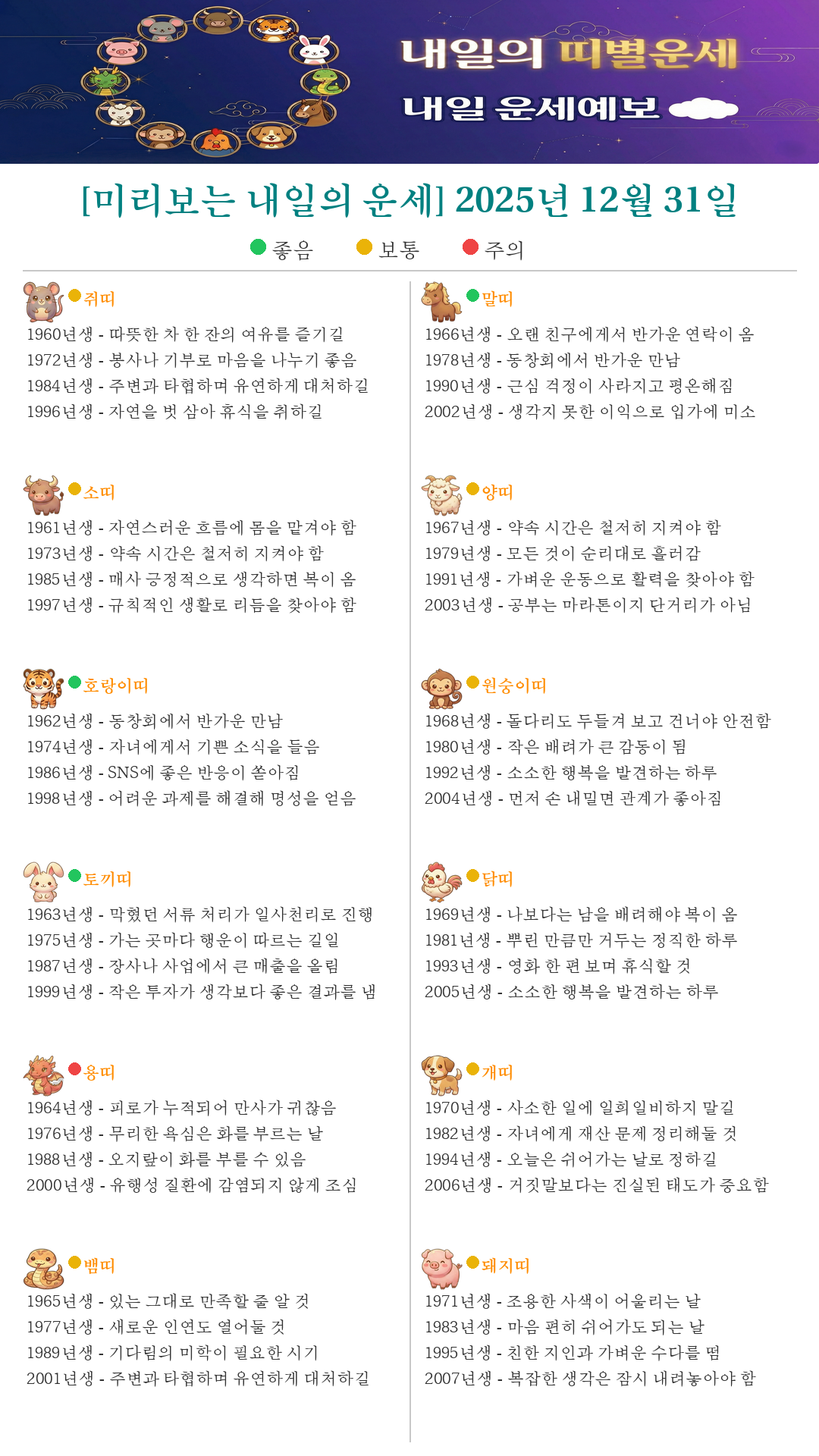 | 하루를 버텨낸 퇴근길, 우리는 내일을 막연히 걱정하면서도 정작 내일을 준비할 시간은 갖지 못한 채 집으로 향합니다. 메타X는 ‘미래를 예측하는 운세’가 아니라, 내일을 조금 더 단단하게 맞이하기 위한 마음의 점검표로서 띠별 운세를 다시 해석하고자 합니다.〈퇴근길 미리보는 내일의 띠별운세〉는 오늘의 피로를 내려놓고, 내일의 선택을 조금 더 차분하게 바라보자는 취지에서 시작됐습니다. AI·기술·데이터의 시대에도사람은 여전히 마음의 방향이 필요하다는 전제 아래, 이 연재는 과장된 예언 대신 ‘생활 밀착형 조언’에 집중합니다. 오늘도 고생 많으셨습니다.[편집자주] |