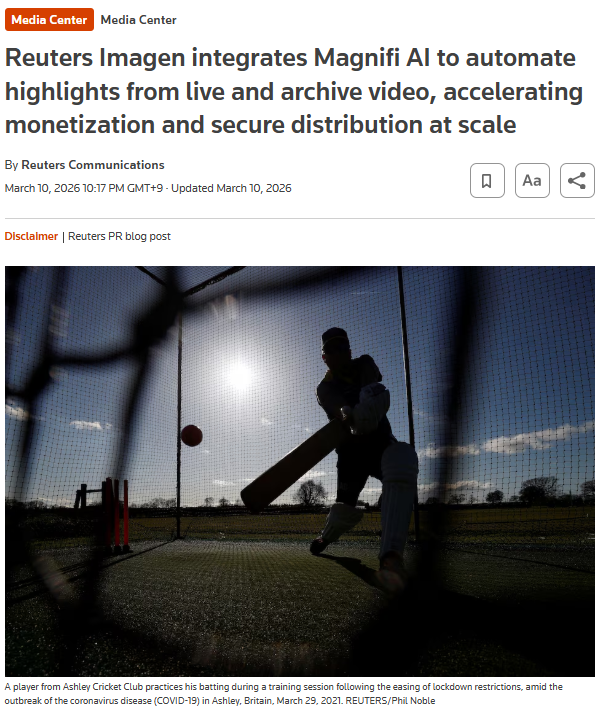 로이터 이젠(Reuters Imagen)은 BBC, Premier League, Australian Open, Major League Baseball 등 세계 주요 스포츠·미디어 조직이 사용하는 영상 자산 관리 플랫폼이다. 수십 년치 뉴스 영상과 라이브 피드가 이 시스템을 통해 저장되고 배포된다. 여기에 Magnifi의 하이라이트 AI가 연결됐다는 것은, AI가 이 방대한 영상 라이브러리 전체를 실시간으로 분석하고 의미 있는 순간을 찾아낸다는 뜻이다.