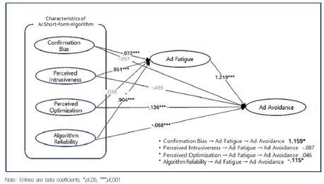 다른 유의한 지점은 '지각된 최적화'가 미치는 차별적 효과를 규명한 것이다. 사용자가 "이 광고가 내 관심사에 잘 맞게 최적화되었다"고 느낄 때, 광고 피로도 자체는 줄어들지 않았다. 하지만 화면을 넘겨버리는 '광고 회피' 행동은 직접적으로 감소시켰다(β=-.136).