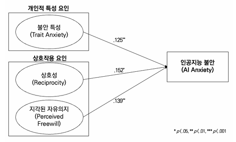 둘째, 예상과 달리 인공지능에 대한 불안감은 인공지능 신뢰에 직접적으로 유의미한 영향을 미치지 않았다. 연구자는 이것이 아직 사용자들이 AI의 위험을 구체적이고 실체적인 위협보다는 잠재적인 측면으로 인식하기 때문일 수 있다고 해석하며, 이 관계에 대한 추가 연구의 필요성을 제기하였다.