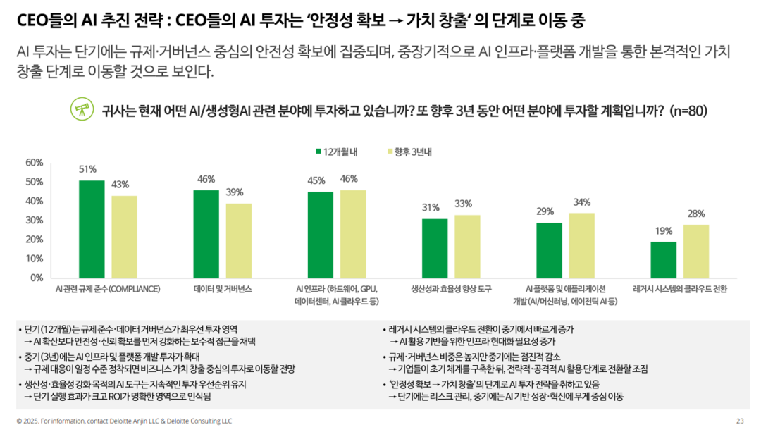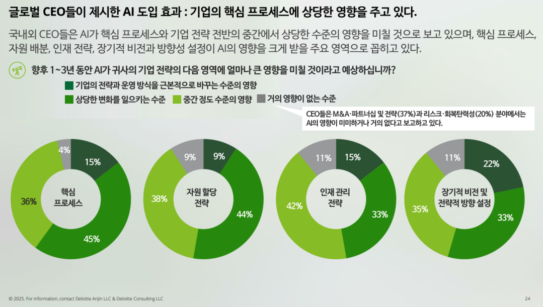 한국 CEO들은 이러한 변화에 특히 적극적인 태도를 보였다. 글로벌 평균 대비 높은 낙관론과 함께, 사이버 위협과 지정학 리스크를 가장 심각한 위험 요인으로 인식하면서도, 공급망 재편과 비용 구조 개선을 병행하는 전략을 선택하고 있다. 불확실성을 위기가 아닌 기회로 해석하려는 경향이 상대적으로 강하게 나타난 것이다.