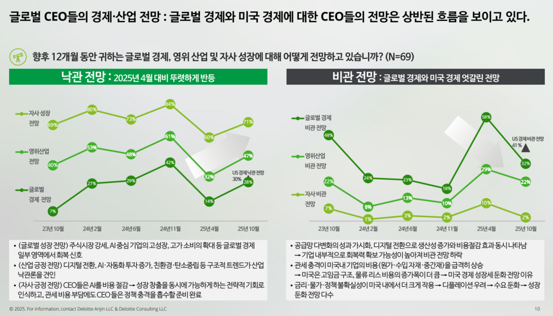 지역별로 보면 CEO들은 미국 경제에 대해서는 여전히 신중한 태도를 유지한 반면, 유럽은 완만한 회복 국면에 접어들 것으로, 아시아·APEC 지역은 상대적으로 견조한 성장을 이어갈 것으로 전망했다. 특히 한국 CEO들은 글로벌 평균보다 높은 수준으로 자사와 산업 전반의 성장 가능성에 대한 자신감을 보였다. 이는 수출과 공급망 기반의 성장 경험, 그리고 AI·디지털 전환을 통한 생산성 개선 여지가 여전히 크다는 인식에서 비롯된 것으로 해석된다.