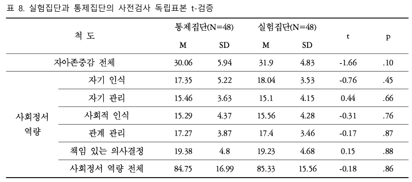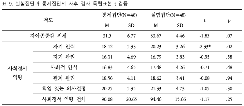 양적 분석 결과 또한 이러한 질적 통찰을 뒷받침한다. C도 소재 초등학교 4학년 학생 96명을 대상으로 5주간 10회기에 걸쳐 프로그램을 적용한 결과, 사후 독립표본 t-검증에서 사회정서역량의 하위 요소 중 '자기 인식' 영역에서 집단 간 통계적으로 유의미한 차이가 나타났다(t=-2.33, p=.02). 또한 실험집단 내의 대응표본 t-검증 결과, 자아존중감 전체(t=-3.11, p=.001)와 사회정서역량 전체(t=-2.86, p=.006) 및 자기 인식, 사회적 인식, 책임 있는 의사결정 등의 하위 요소에서 유의미한 향상이 확인되었다. 반면 통제집단에서는 자기 인식이나 책임 있는 의사결정 영역에서 유의미한 변화가 나타나지 않았다.
