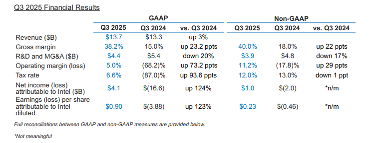 2025년 3분기 인텔의 매출은 137억 달러, 순이익은 41억 달러로 집계됐다. 작년 같은 기간엔 166억 달러 적자였다. 말 그대로 적자에서 흑자로 뒤집은 것이다.