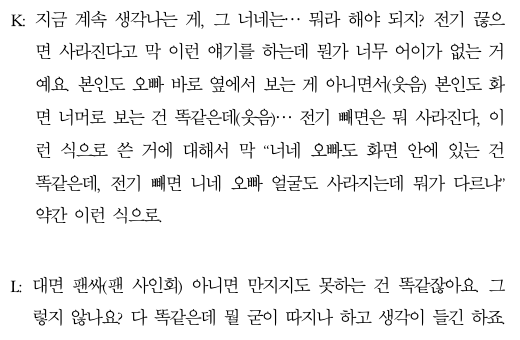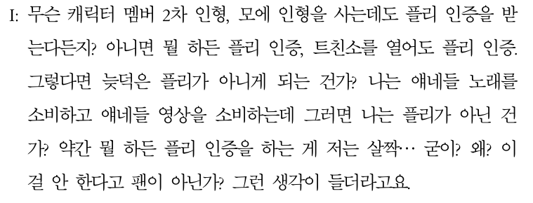 그러나 인정투쟁이 과열되면서 팬덤 내부는 뜻밖의 위기에 직면했다. 공동체의 목적인 '성적'을 달성하기 위해 구성원 개개인에게 '진정한 팬'임을 증명하라는 압박이 거세진 것이다. 연구자가 포착한 '플리 인증' 문화는 이를 단적으로 보여준다. 유료 플랫폼 가입이나 스트리밍 횟수를 수치로 증명하지 못하는 라이트 팬이나 신입 팬은 연대의 대상에서 배제되기도 했다. 더욱이 '오타쿠 취급'에 대한 트라우마는 내부 검열로 이어져, 코스프레와 같은 2D적 문화실천을 하는 팬들을 사이버 불링하는 사태까지 낳았다. 외부로부터 인정받기 위해 세운 기준이 오히려 내부 구성원을 평가절하하고 소외시키는 백래시로 작용한 셈이다.