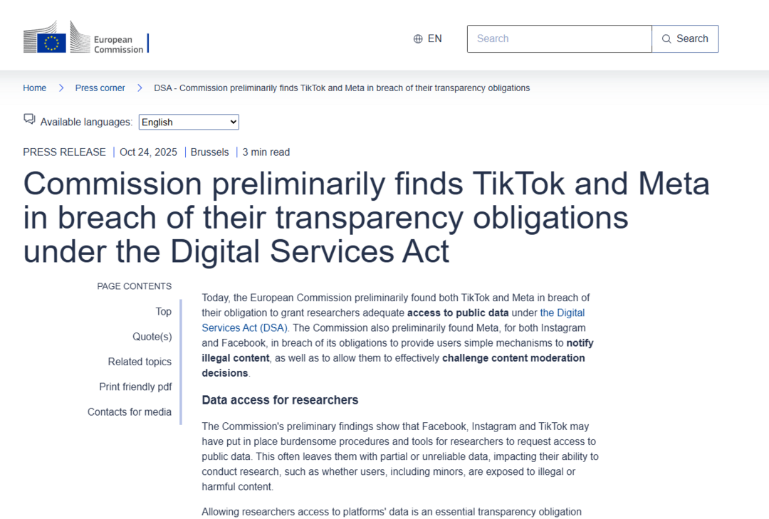 2025년 10월 24일(현지시간), 유럽연합 집행위원회는 틱톡과 메타(페이스북·인스타그램 포함)가 DSA에서 정한 “연구자에게 공공 데이터 접근을 허용할 의무” 및 “사용자의 불법 콘텐츠 신고 및 이의 제기 권한 보장 의무” 를 제대로 이행하지 않았다고 밝혔다.