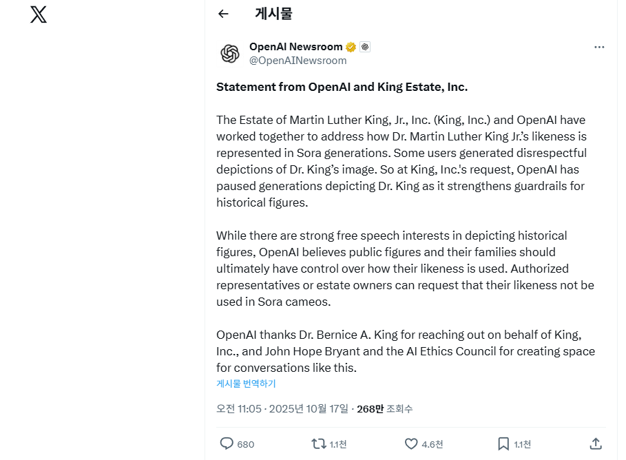 OpenAI는 곧바로 해당 요청을 수용하고, “사용자 생성물이 킹 목사의 유산을 모욕한 사례가 있었다. King Inc.의 요청에 따라 관련 생성을 일시 중단하고, 역사적 인물 보호를 위한 가드레일을 강화하겠다”고 밝혔다.