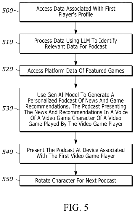 두 번째는 대본 생성이다. 수집된 데이터를 바탕으로 LLM이 해당 플레이어만을 위한 팟캐스트 대본을 생성한다. 내용은 게임 팁, 친구 활동 업데이트, 신작 추천, 소프트웨어 업데이트 안내 등으로 구성되며, 특허 문서에는 "플레이어를 향한 농담"도 포함될 수 있다고 명시되어 있다.
