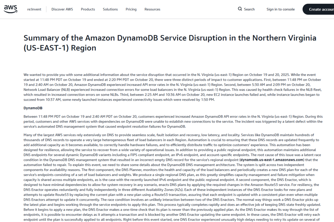 미국 서부시간(PDT) 기준 2025년 10월 19일 밤 11시 48분부터 10월 20일 오후 2시 20분까지, AWS의 북부 버지니아 리전(us-east-1)에서 대규모 서비스 장애가 발생했다. 영향은 세 갈래로 나뉜다.