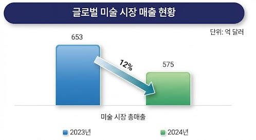 2025년 현재, 글로벌 미술 시장은 뚜렷한 침체 국면에 진입했다. 아트바젤(Art Basel)과 UBS가 발표한 데이터에 따르면, 2024년 전 세계 미술 시장 총매출 규모는 약 575억 달러(약 79조 9,250억 원)로, 전년도 653억 달러 대비 12%나 감소한 것으로 집계되었다.