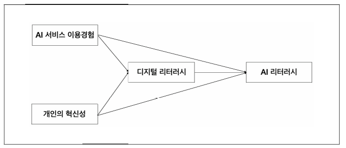 본 연구는 반두라(Bandura)의 사회 인지 이론(Social Cognitive Theory)을 이론적 틀로 삼아 AI 리터러시 형성 과정을 설명한다. 사회 인지 이론의 삼원적 상호 결정론에 따르면, 인간의 학습과 행동은 '개인적 요인', '환경적 요인', '행동적 요인'이 서로 상호작용하며 이루어진다. 연구진은 이러한 이론적 배경을 바탕으로 AI 서비스 이용 경험을 행동적 요인으로, 개인의 혁신성을 개인적 요인으로 설정했다. 즉, 개인이 AI 서비스를 실제로 이용하는 행동과 새로운 기술을 받아들이려는 성향이 상호작용하여 AI 리터러시라는 역량을 형성한다고 본 것이다. 또한, 디지털 환경이라는 맥락을 고려하여 기존의 디지털 리터러시가 AI 리터러시 형성의 전제 조건이자 매개체 역할을 수행한다고 가정했다.