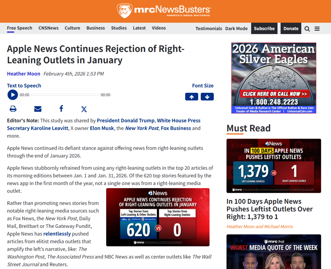 논쟁의 근거로는 우익 성향 싱크탱크로 분류되는 Media Research Center(MRC) 계열의 모니터링 보고서가 인용된다. 해당 자료는 2026년 1월 한 달간 애플 뉴스 ‘모닝 에디션’ 상단 기사 구성에서 우성향 매체가 사실상 배제됐다는 취지로 주장한다. 다만 이는 애플의 공식 검증이나 제3자 독립 감사 결과가 아니라 특정 진영의 분석이라는 점에서 한계를 지닌다.