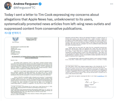 [메타X(MetaX)] 미국 연방거래위원회(FTC) 앤드루 퍼거슨 위원장이 팀 쿡 애플 CEO에게 서한을 보내, 애플 뉴스가 이용자에게 충분히 알리지 않은 채 특정 정치 성향 매체를 체계적으로 부각하거나 배제했다면 FTC법 위반 소지가 있을 수 있다고 문제를 제기했다.