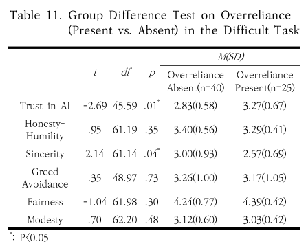특히 성격 5요인(Big Five) 모델을 넘어 HEXACO 모델의 '정직-겸손성' 요인에 주목한 점이 독특하다. 분석 결과, 어려운 과제 상황에서 AI의 오류를 비판 없이 수용한 집단은 그렇지 않은 집단에 비해 정직-겸손성의 하위 요인인 '진실성(Sincerity)' 점수가 유의하게 낮았으며(t=2.14, p<.04), AI에 대한 신뢰도는 훨씬 높았다(t=-2.69, p<.01). 이는 자신의 이익을 위해 시스템을 이용하려는 욕구가 강하고 스스로의 윤리적 검증 기제가 느슨한 개인일수록, AI가 내놓는 틀린 답안을 편리한 도구로서 그대로 받아들일 위험이 큼을 실증적으로 증명한 것이다.