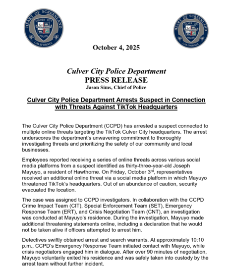 컬버시티 경찰국장 제이슨 심스(Jason Sims)는 “이번 사건은 경찰의 신속한 대응과 기업 보안팀의 협력이 가져온 결과”라며 “우리 부서는 모든 위협을 철저히 조사하며, 지역 사회와 기업의 안전을 최우선으로 한다”고 밝혔다. 틱톡 보안팀 역시 경찰과 긴밀히 협조하며, 현장 대피와 상황 대응을 체계적으로 수행한 것으로 전해졌다.