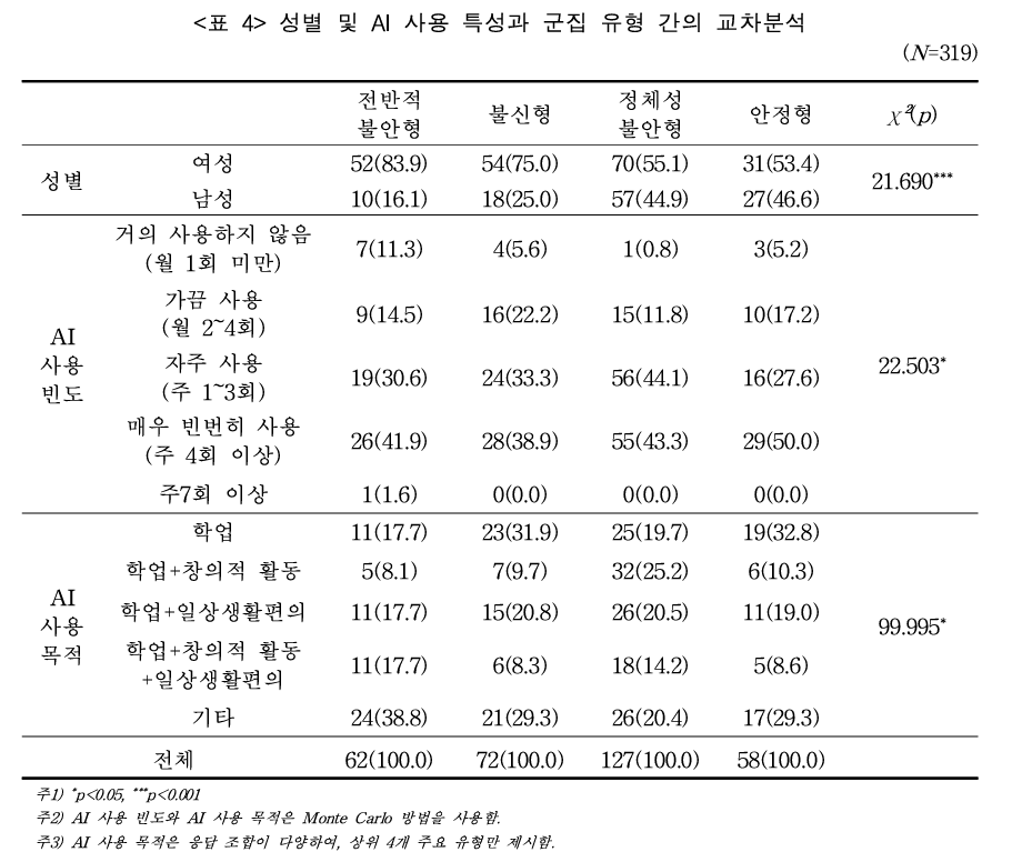 연구 데이터는 성별에 따른 불안 분포에서도 유의미한 차이를 드러냈다. '전반적 불안형'의 경우 여성이 83.9%로 압도적인 비율을 차지했으며, '불신형' 역시 여성(75.0%)의 비중이 높았다. 이는 기술 수용 과정에서 여성이 남성보다 잠재적 위험 요소나 윤리적 신뢰성에 더 민감하게 반응할 가능성이 있음을 보여준다. 반면, '정체성 불안형'과 '안정형'에서는 남녀 비율이 비교적 균등하게 나타났는데, 이는 기술이 주는 실존적 위협이나 도구적 가치 인식은 젠더의 경계를 넘어 보편적인 양상으로 나타나고 있음을 의미한다.