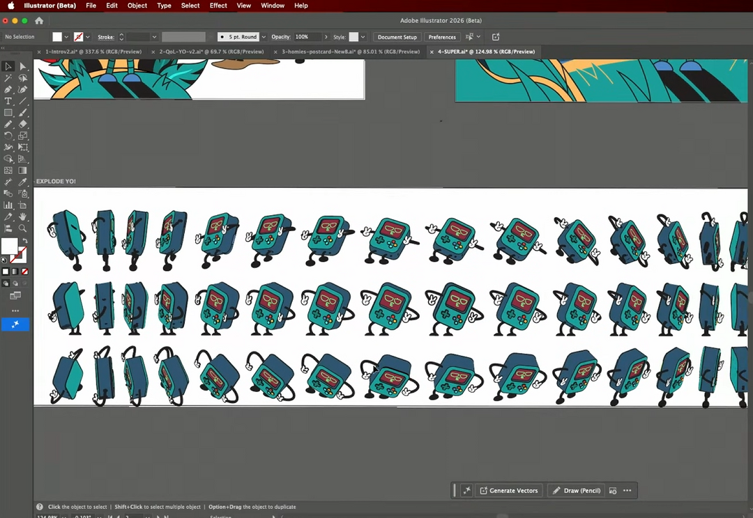 턴테이블은 일러스트레이터에서 백터 이미지의 다른 부분을 인공지능이 상상해서 다른 각도에서 그려내는 기능이다. 뿐만 아니라, Explode를 사용하면 이렇게 생성된 모든 각도(정면, 측면, 후면, 윗면 등)의 결과물들을 아트보드 위에 한꺼번에 펼쳐서 보여준다.