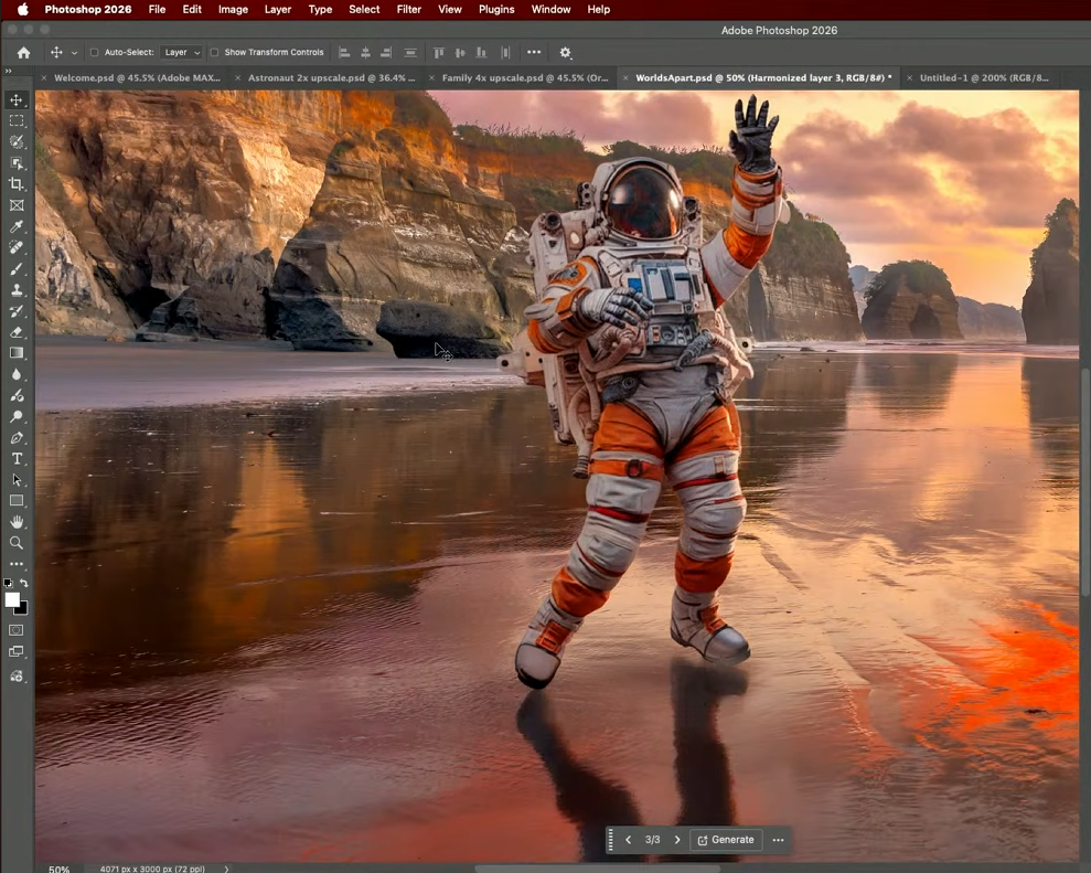 서로 다른 이미지에서 가져온 사진들은 조명상태가 달라 어색하게 보인다. 이것을 자연스럽게 만들어주는 일이 디자이너들이 많은 시간을 들여 하는 일이었는데, 하모나이즈는 조명상태 뿐만 아니라 주변 반사체나 그림자까지 만들어 줄 수 있다. 이는 수동으로 컬러 밸런스나 커브를 조정해야 했던 복잡한 작업을 인공지능이 대신해주는 기능이다.