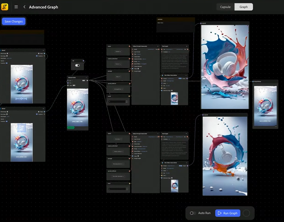 프로젝트 그래프는 포토샵의 배경제거, 일러스트레이터의 벡터 변환, 파이어 플라이의 이미지 생성, Adobe color의 생상 팔레트 적용, 심지어 구글이나 OpenAI파트너 AI 모델의 기능까지 각각의 기능을 노드로 만든다. 사용자는 이 노드들을 시각적으로 연결하여 자신만의 복잡한 작업흐름(Graph)를 만들 수 있다.