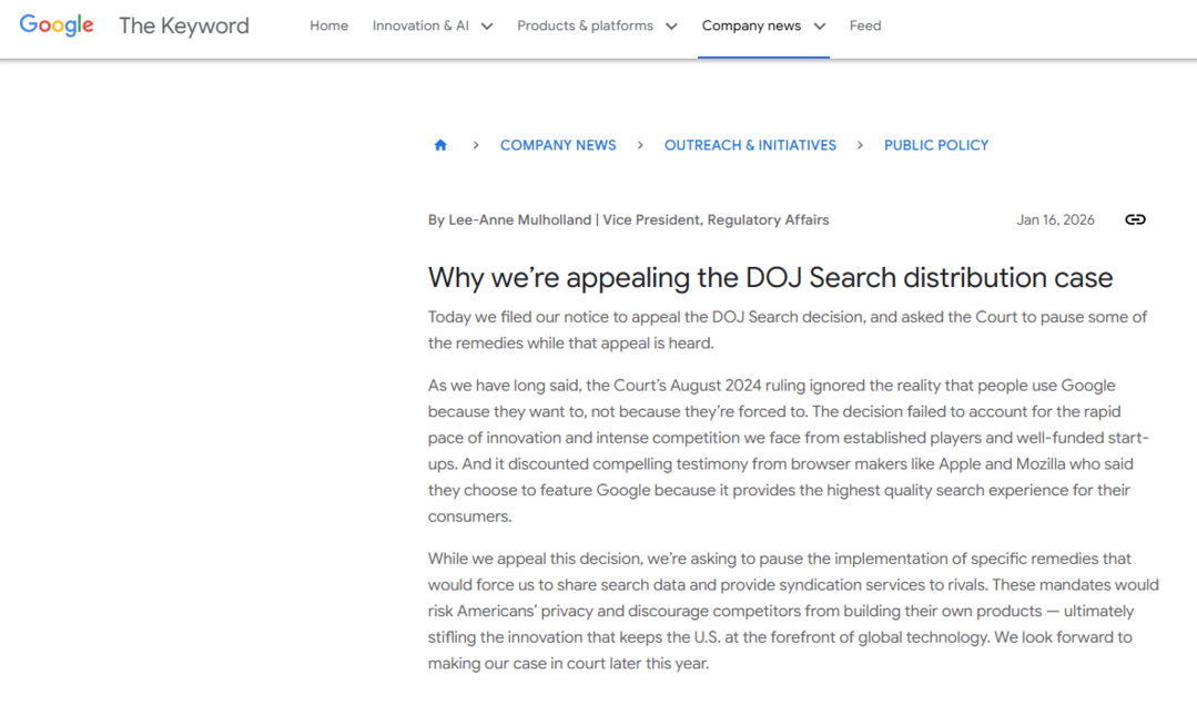 Google이 미국 법무부의 검색 유통(Search distribution) 관련 반독점 판결에 불복해 공식 항소에 나섰다. 구글은 항소와 함께 판결에 포함된 일부 시정조치의 즉각적 집행을 중단해 달라고 법원에 요청하며, 이번 사안이 단순한 기업 분쟁을 넘어 플랫폼 경쟁 질서와 데이터 개방의 한계를 가르는 중대 분기점이라고 주장했다.