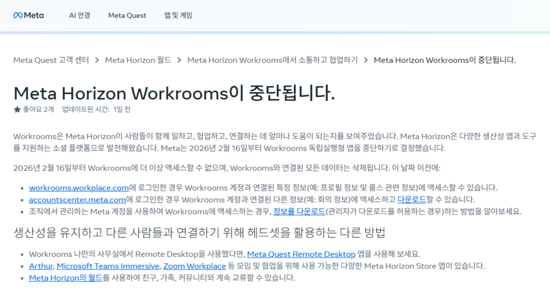 Meta가 VR 협업 서비스 Horizon Workrooms를 공식 종료한다. 메타는 2026년 2월 16일부로 Workrooms의 독립 실행형 앱 서비스를 중단하고, 서비스와 연동된 사용자 데이터를 전면 삭제하겠다고 밝혔다. 이는 메타버스 기반 업무 공간이 상용 협업 도구로 정착하는 데 직면한 한계를 상징적으로 보여주는 결정으로 평가된다.